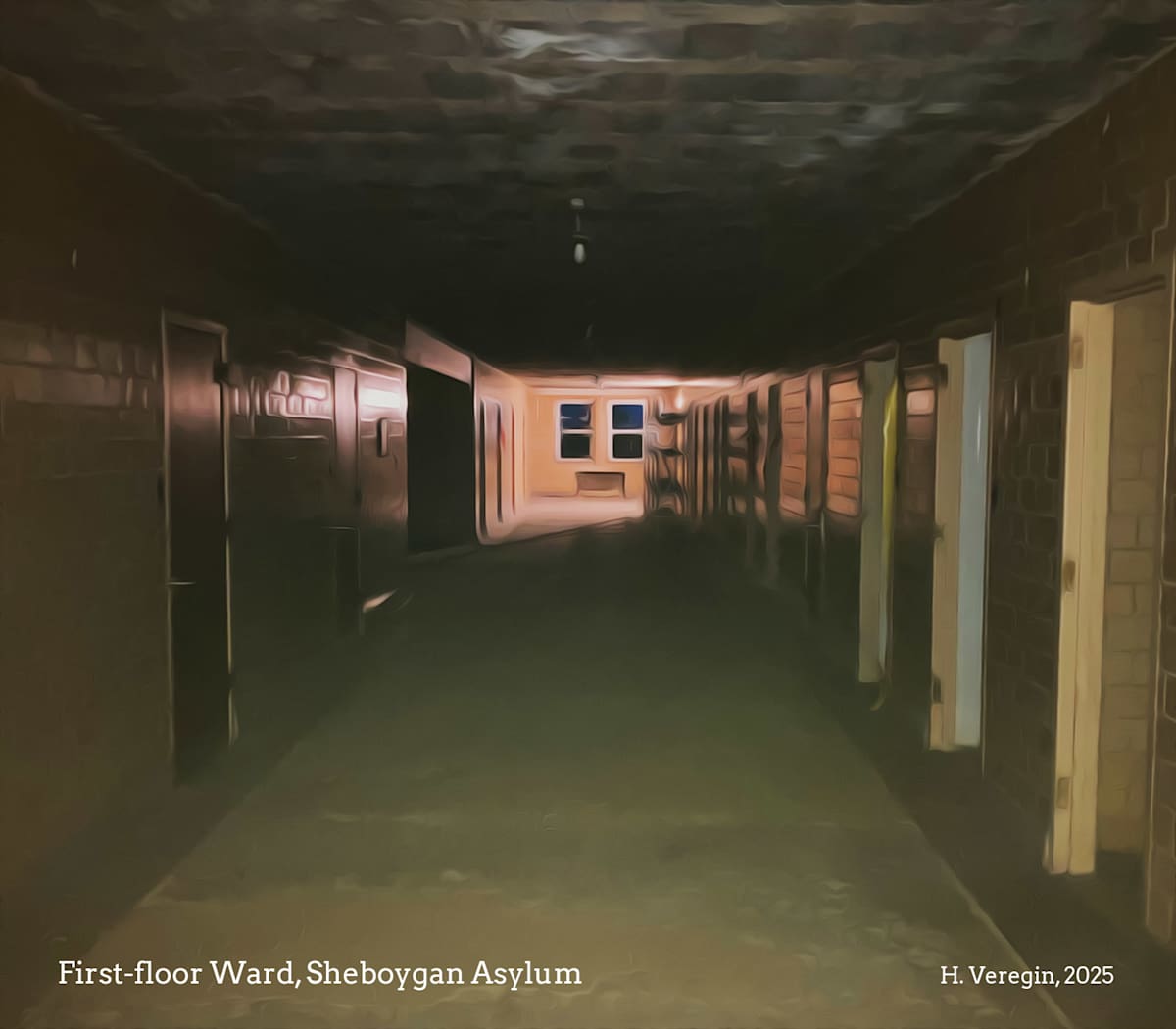 Sheboygan County Asylum’s real name is Sheboygan County Comprehensive Health Care Center. Located close to Waldo in a rural part of the county, the center was built in 1939 and was very modern for its day. The huge building has a central spine of administrative offices and facilities, flanked on each side by a V-shaped wing, three stories high, where the patients lived. From the air, the building looks like a dragonfly.