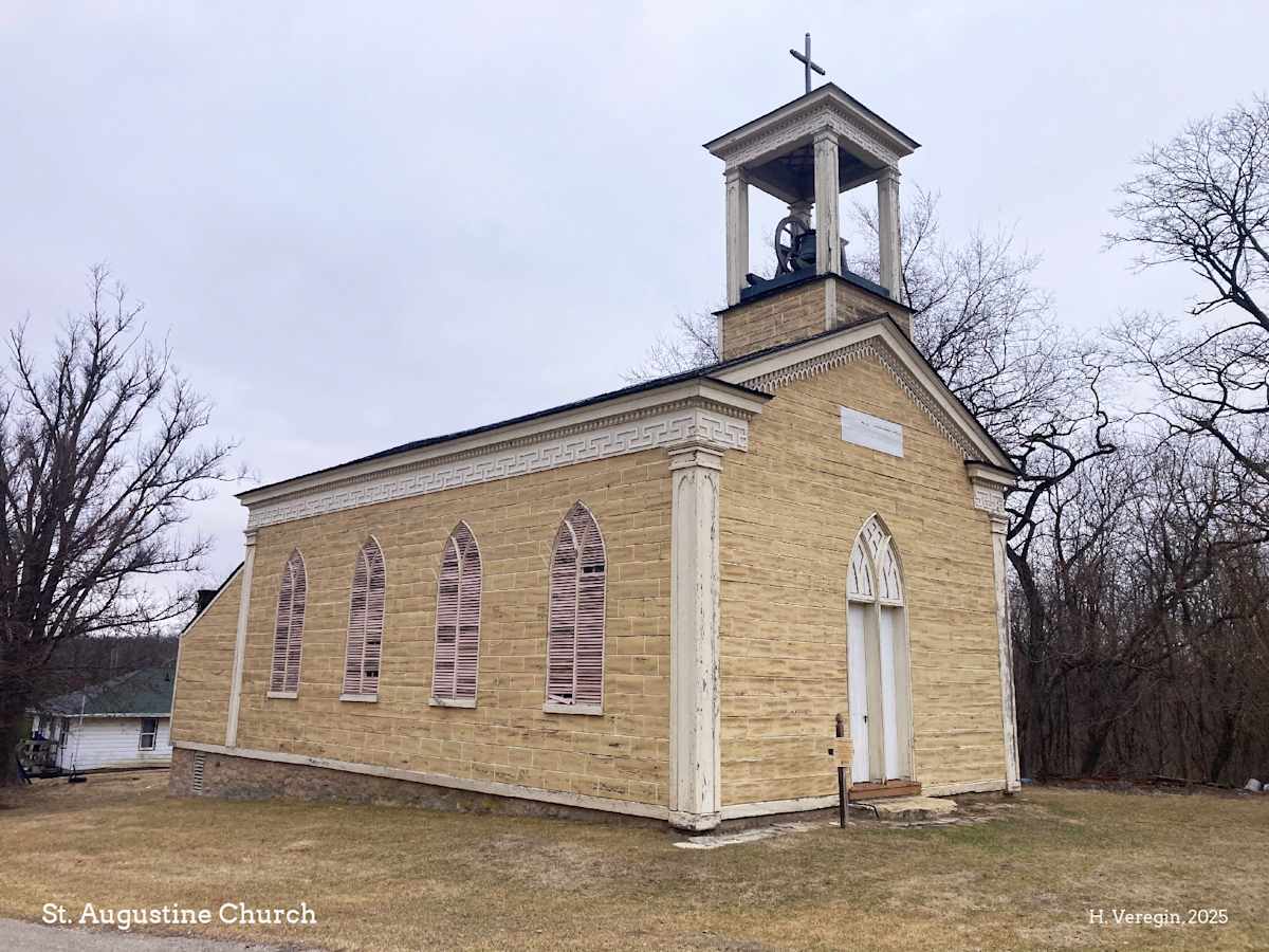 St. Augustine Church, in the unincorporated community of New Diggings in southwest Lafayette County, is remarkable for its age and construction. Built in 1844-47 for the Irish families in the area, it is nearly two hundred years old. When the church was built, Wisconsin was not yet a state, and the Public Land Survey System, which ultimately divided Wisconsin into one-mile by one-mile blocks of land to enable private ownership, had just been initiated at a point a few miles to the west. [3]