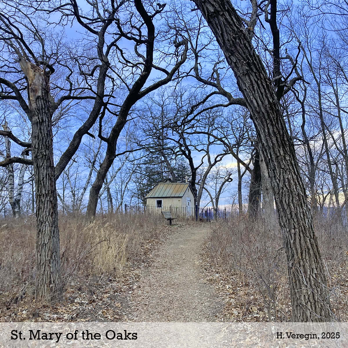 St. Mary of the Oaks is a tiny chapel that sits on the crest of a hill in northwest Dane County, overlooking Indian Lake 200 feet below. The chapel, less than 10 feet on a side, was built in 1857. Today the property is owned by Dane County and is part of Indian Lake County Park. The hilltop is covered in old growth Oak-Hickory forest over 100 years old, and probably looks much like it did when the chapel was constructed almost 170 years ago.