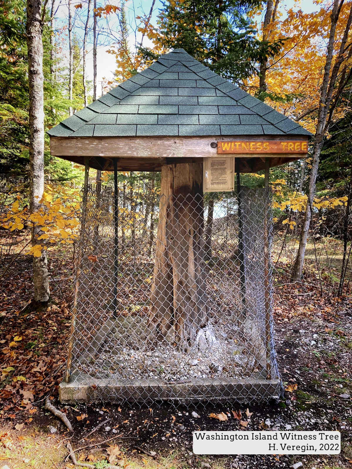 It’s a few hundred feet from the Lake Michigan shoreline on the east side of Washington Island in Door County. It’s the trunk of a long-dead tree. It sits on a crumbling concrete foundation, surrounded by a wire fence and capped with a roof to keep off the rain and snow. A monument to a tree? [1]